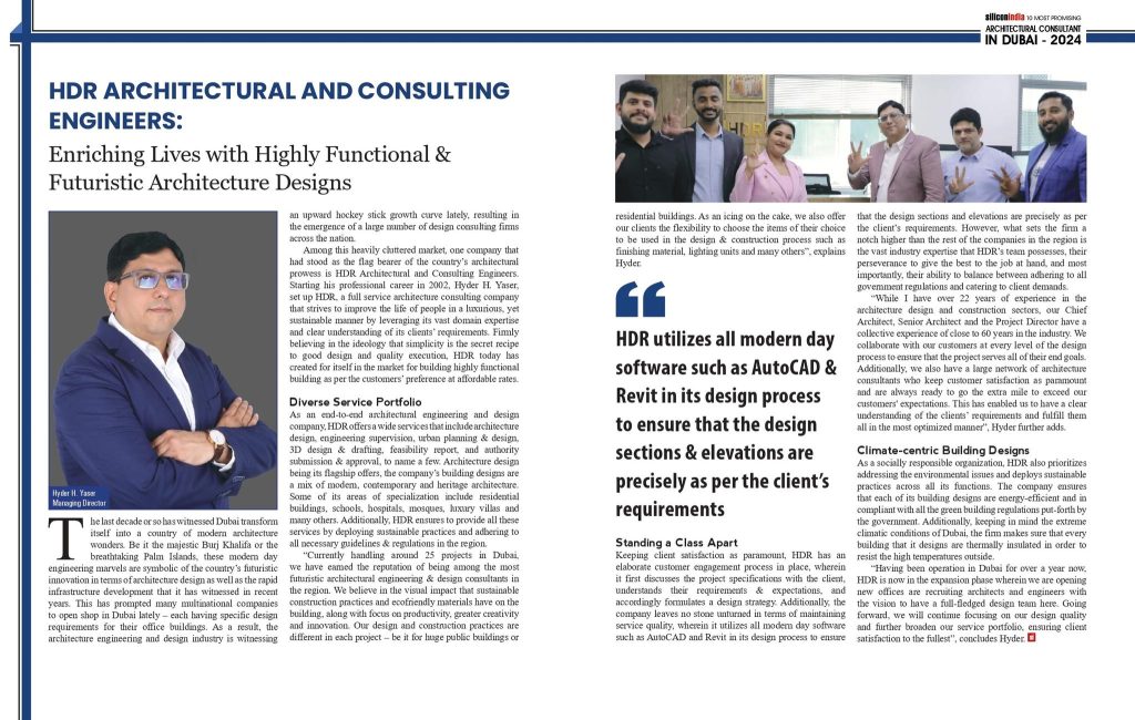 HDR is an Architectural Engineering company of professionals and experts in the UAE. It is prime goal is developing urban living standards that enhance and enrich the peoples life style. On 25th of APRIL 2023 , unleashed its office in Dubai U.A.E., founded by Mr Hyder His vision was to create innovative, luxurious. comfortable and sustainable architectural solutions that enrich people; life and experienced Architects, Engineers worked with developers and respective Clients. HDR is an inter disciplinary, excellence and innovation – based company. Founded on the belief that architecture has a powerful impact on enriching people life, as well as having massive influences in enhancing and improving the world we live in.